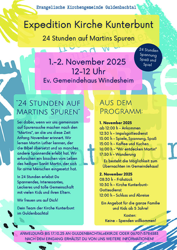 • Samstag 12:00 Uhr - Sonntag 12:00 Uhr : Expedition „Kirche Kunterbunt“ für die ganze Familie – „24 Stunden auf Martins Spuren“